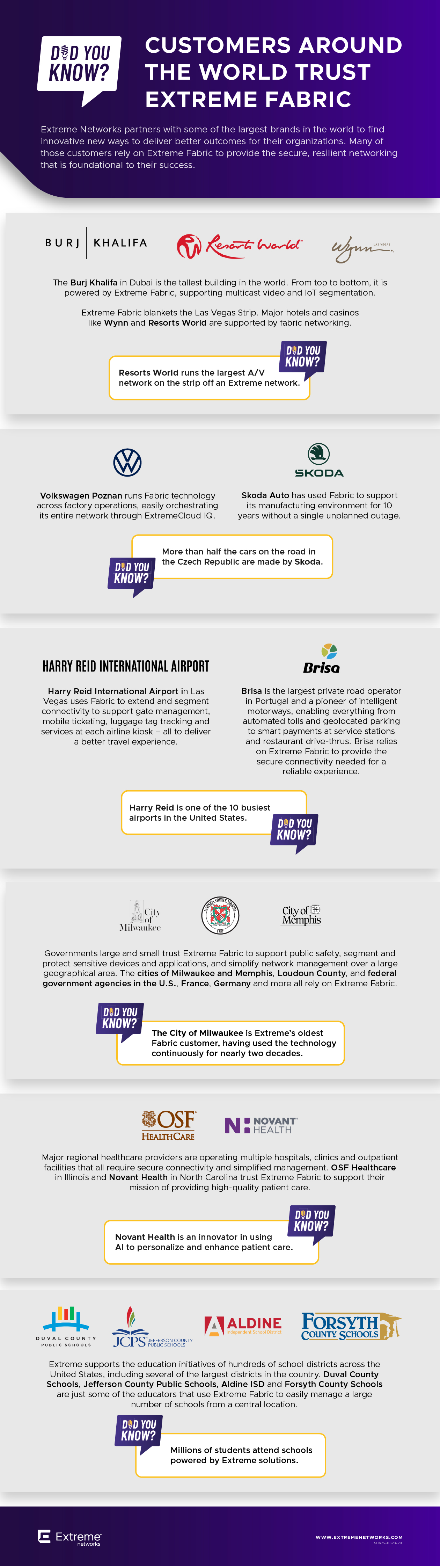 Take a TourThe most innovative organizations around the world trust Extreme Networks. In this infographic, find out how leaders across industries are simplifying operations and delivering better outcomes with Extreme Fabric.